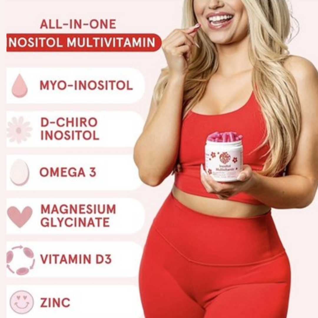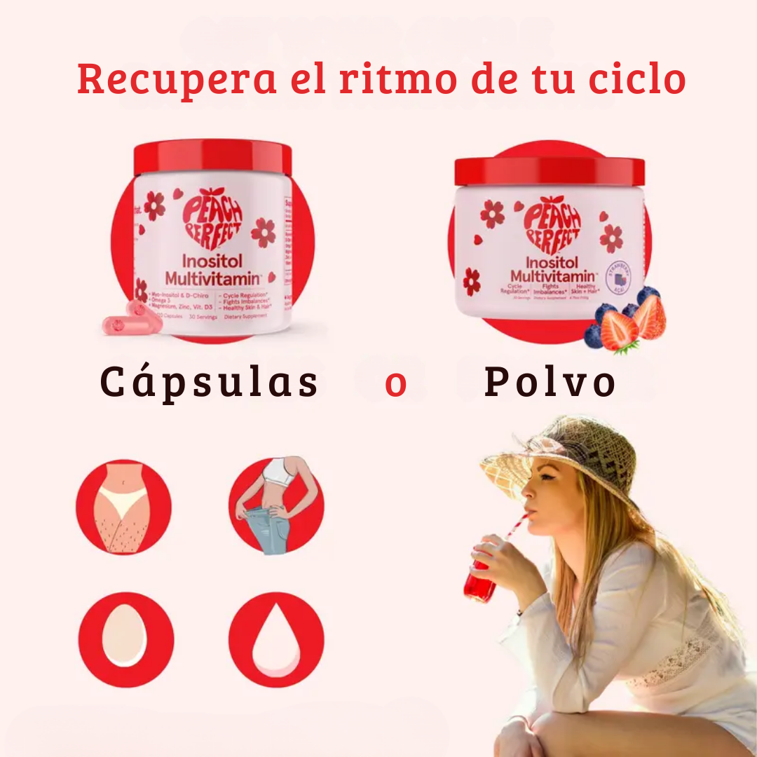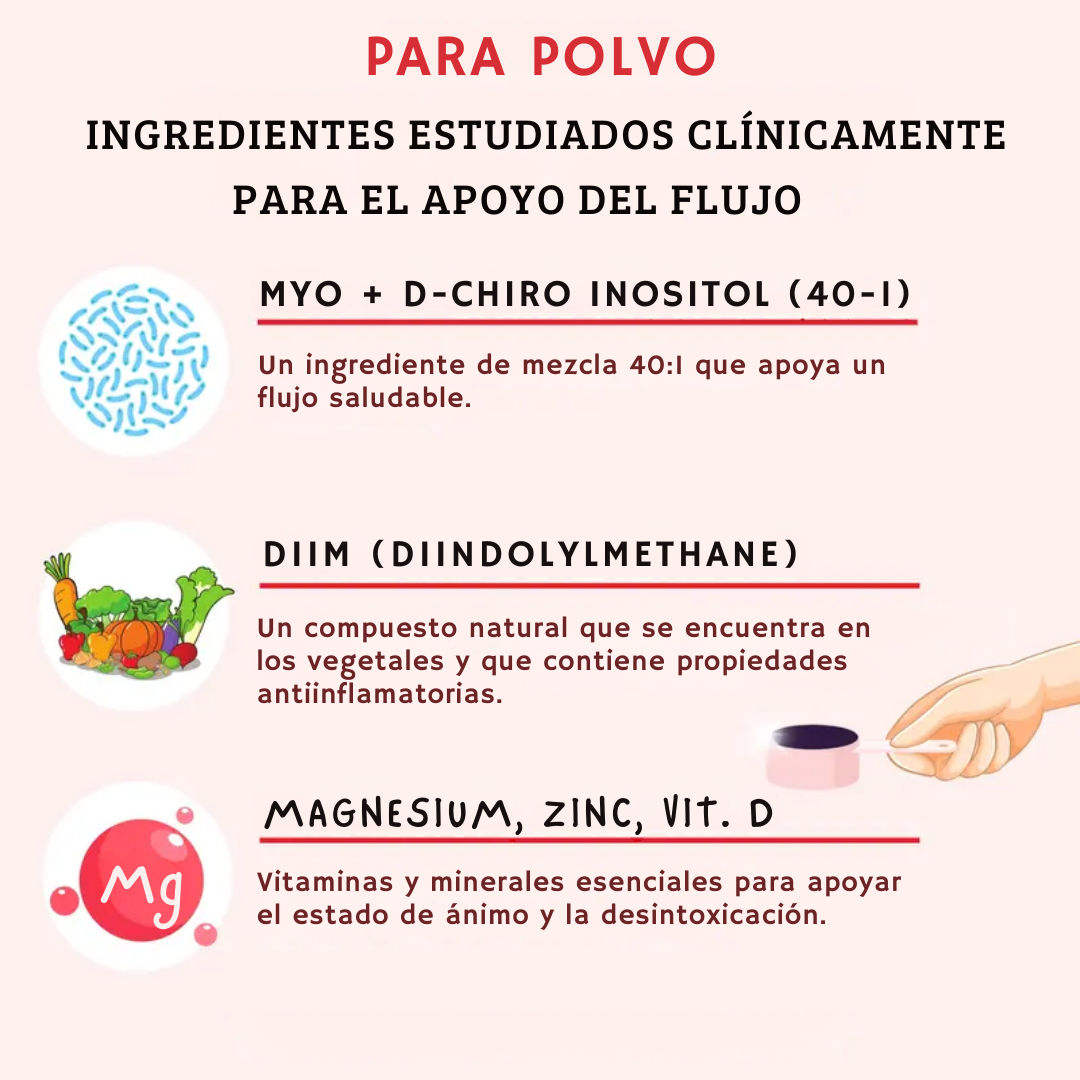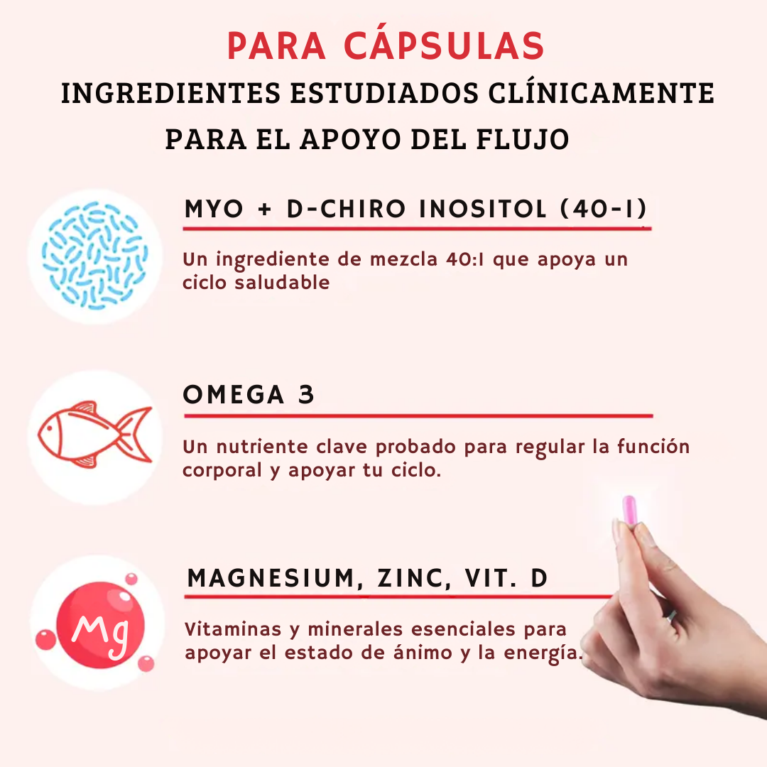 La combinación de Myo-Inositol y D-Chiro Inositol junto con vitaminas y minerales ayuda a mejorar la sensibilidad a la insulina y a equilibrar hormonas, lo que se traduce en ciclos más regulares y menos molestias premenstruales.
